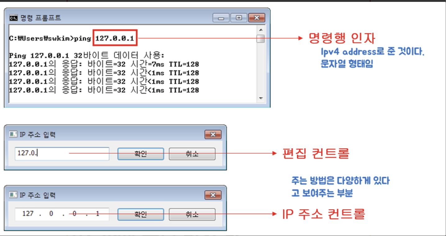- 윈도우 응용 프로그램에서 IP 주소를 입력받을때, ‘문자열’ 형태로 전달받게 되므로 네트워크 통신을 위해 이를 32bit( IPv4)나 128bit(IPv6) 숫자로 변환해야한다.