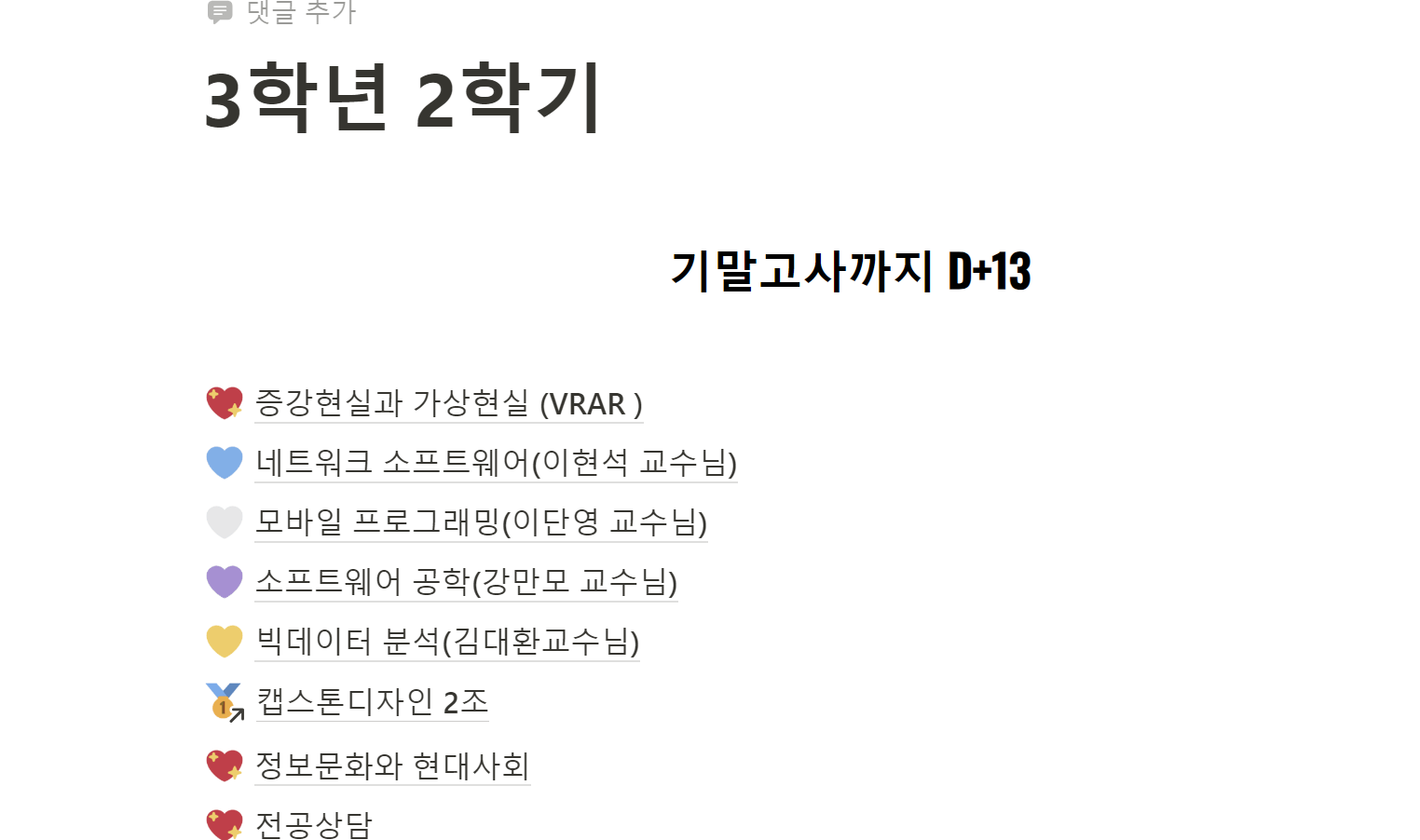 이번 학기에는 텀 프로젝트가 정말 정말 많았다. 저 과목들 중에, '증강현실과 가상현실', '네트워크 소프트웨어', '모바일 프로그래밍' , 총 세 과목이 텀 프로젝트가 있다. 심지어 '캡스톤 디자인 '과목은 졸업 작품이다. 진짜 텀프로젝트를 하며 너무너무 힘들었다.