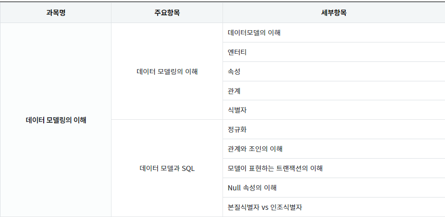 - 데이터 모델링의 이해, SQL 기본 및 활용 크게 두 파트로 나누어져 있다.